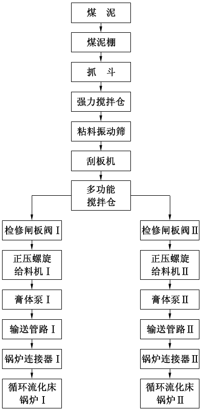 工艺描述:煤泥经过抓斗将其运送至强力搅拌仓,经强力搅拌仓搅拌均匀后打开仓门使煤泥进入粘料粘料粘料振动筛,在粘料粘料粘料振动筛的不断振动下将大颗粒煤泥或杂物分筛出去,较细小的煤泥颗粒则进入送料刮板机,沿着刮板机的输送方向,煤泥被输送至多功能搅拌仓,经过多功能搅拌仓的搅拌后,煤泥流经检修闸板阀,进入正压螺旋给料机,在正压螺旋给料机的旋转挤压作用力下,煤泥落入膏体泵送料机构,膏体泵液压站作为动力源为膏体泵送料机构提供动力,将煤泥通过密闭管路泵送至锅炉连接器,最终到达循环流化床锅炉进行焚烧发电。