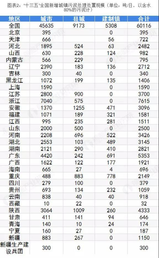 2017年1月,国家发展改革委会同住房城乡建设部编制了《“十三五”全国城镇污水处理及再生利用设施建设规划》,规划中明确提出“十三五”期间城镇污水处理及再生利用设施建设共投资约5644亿元,其中新增或改造污泥无害化处理处置设施投资294亿元,新增或改造污泥(按含水率80%的湿污泥计)无害化处理处置设施能力6.01万吨/日。