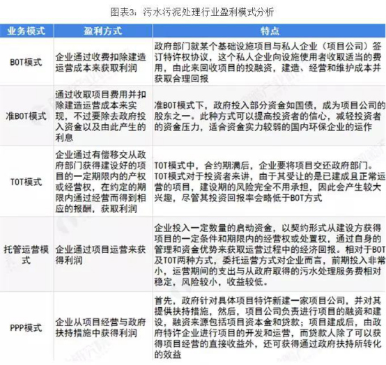 2018年,在“十三五”的推动下,环保重要性仍继续大幅提升,在污泥处置政策方面,区别于前几年以投资规划为主的政策导向,预计未来2-3年,将逐步建立全面的收费机制,将污泥处置纳入社会成本中。目前,污水污泥处理行业盈利模式共有五种,分别是BOT模式、准BOT模式、TOT模式、托管运营模式、PPP模式。